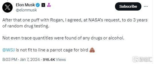 马斯克周日通过X平台发布信息,澄清自己并未吸毒,他称,在与罗根吸入气体之后,他应NASA的要求,同意接受为期三年的随机药物检测,检测过程中并未检测出任何毒品或酒精成分。