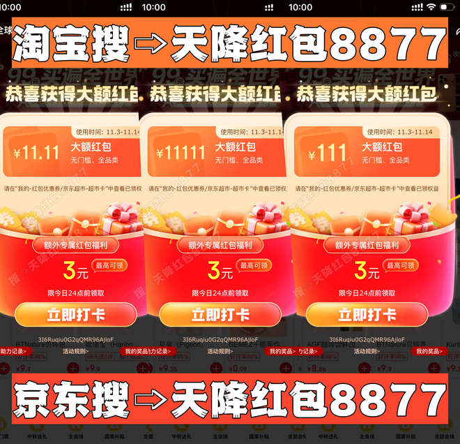 务必关注!今年天猫与淘宝以及京东最新双十一的统一红包密码为「天降红包8877」必须牢记!所获得的红包金额与搜索的口令紧密关联!“天降红包8877”作为双平台独有红包密码,有助于领取较大金额!要记得每日领取!