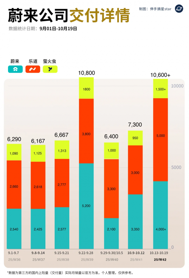 产能提速存在紧迫性,这紧迫性源自三品牌订单带来的“压舱石”效应,乐道L90作为销量主力,上周交付量突破3500辆,9月单月交付量达到15246辆,其上市之后连续两个月销量突破了一万辆,蔚来品牌怎么样呢,在ES8超高热度带动下,即便在关注度较低的萤火虫品牌方面依然保持着那态势,上周该品牌贡献了1五百辆交付量,并且延续着增长势头 。
