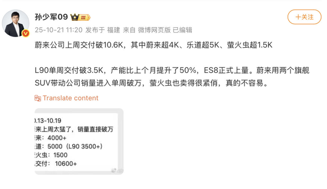 由业内人士所披露的最新周销量数据表明,在10月的第三周,蔚来单周的整体交付实现了突破,数量超过一万辆,具体达到了10,600辆,这一情况意味着当下蔚来的月度交付能力已经拥有了冲击4万辆以上的基础,并且数字背后的含金量还在持续不断地上升 。