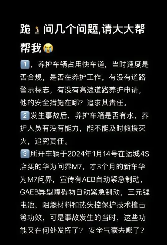 近日,在山西运城的地方,有一辆问界 M7与养护车相接撞之后起火了,这件祸事使得3个人丧失生命。相关生者家属有表示,车上一同的3个人,身为丈夫的那个人、家里的弟弟以及儿子,这三个人都非常不幸地没有在灾难里存活下来 。