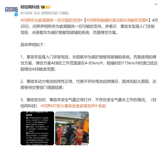 随后,另外依据@财经网科技所发布的消息,在4月28日这一天,问界发表声明声称会给家属予以所有能够做到的支持,并且还表明,出事的车型是入门的非智驾版本,没有搭载华为的高阶智能驾驶辅助系统,采用的是博世方案。