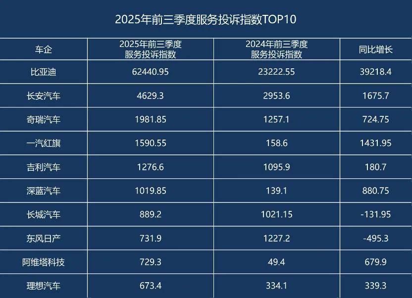 近日,依据汽车门网所传消息,在2025年的前三季度期间,汽车门网投诉指数朝着同比方向大幅上涨了38.53%,当中服务类投诉指数达到了90455.3之高,其占比为55.5%,这一占比远远高于去年。有数据显现,去年同一时期服务类投诉指数仅仅是47013.2,占比为40%。服务类投诉出现大幅上涨,毫无疑问成为了投诉指数疯狂上涨的直接促使力量,而比亚迪凭借自身的种种情况,成为了服务类投诉指数快速上升的关键缘由。