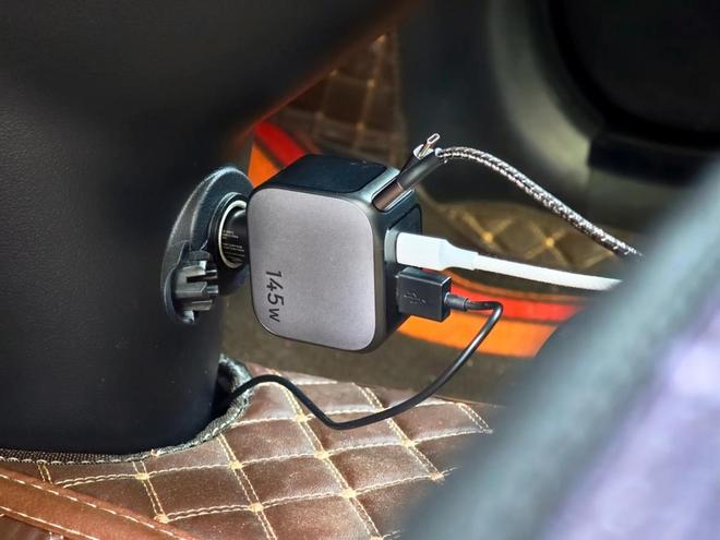 四口同时开启,且具备 145W 的狂暴输出,这才是真正的硬实力!它结合了 PDS 充电技术,能智能分配电流,达成四口快充。主驾单口的 Type-C,直接插入笔记本可跑满 100W 且速度不减,副驾能让手机进行 65W 的闪充快速回血,后排两个接口还能分给平板和耳机使用。每个接口都带有 LED 灯光,即便在夜间充电时也能够看得见。