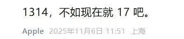 苹果官方的公众号,于11月16日上午时分,忽然进行喊话,内容是:1314比不上当下就选择17,历经三年的等候,是值得进行一次iPhone17Pro换代的。 。