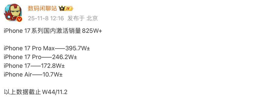 就目前的情况来看,一直到11月2日这个时间节点,iPhone 17系列这种产品,在国内范围之内,被激活之后的销售数量,已然是突破了825万台之多,而像这样的情况,在整个手机市场领域当中,都能够算得上堪称“现象级”的成绩了。