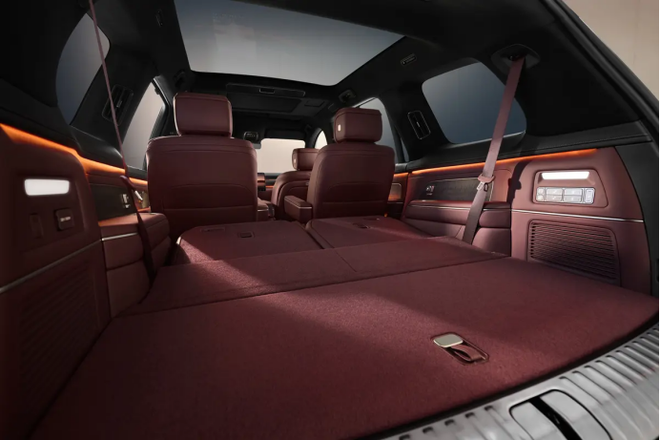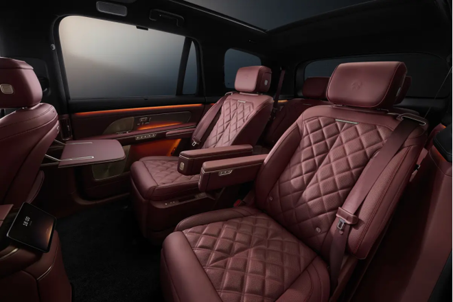 车内有六座以及七座这两种布局形式,用来制作座椅的材质是Nappa真皮,副驾那的座椅是零重力座椅,六座版本所采用的座椅布局是2+2+2这种规格,其第二排座椅还都是零重量感能带来舒适体验之类似零重力的座椅,第三排安排了两个各自独立的座椅,并且存在能够前后滑动达130mm的行程,七座版本采用的座椅布局是这种2+3+2的形式,第二排座椅具备对于乘坐者进行加热、通风以及按摩等功能的能力特性,第三排座椅存有靠背角度为130°这样的角度范围。