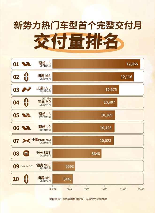对于新势力品牌,那些首个完整月就能达成过万交付量的车型,首先在数量方面极为稀少,像理想 L6、小米 SU7、小鹏 MONA M03、问界 M8等。其次,L90在这些众多车型里的数字排序能够处于前三的位置 。