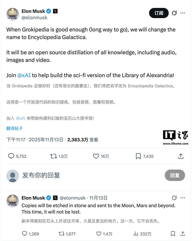 马斯克还声称,Grokipedia恰似“现代版的亚历山大图书馆”,“亚历山大图书馆被烧毁是人类历史当中的一个大悲剧”,“出于让知识不再遭遇同样命运的考量,我觉得应当将内容铭刻在石板之上,采用微缩字体加以保存,且要尽可能广泛地进行分发”。