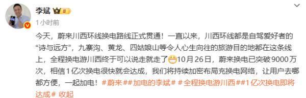 在11月18日,蔚来正式宣告川西环线换电路线整个全线实现贯通连通 ,蔚来创始人兼CEO李斌于社交媒体之上表明称 ,在10月26日 ,蔚来换电已然突破9000万次 ,坚信1亿次换电很快就能够达成实现 。