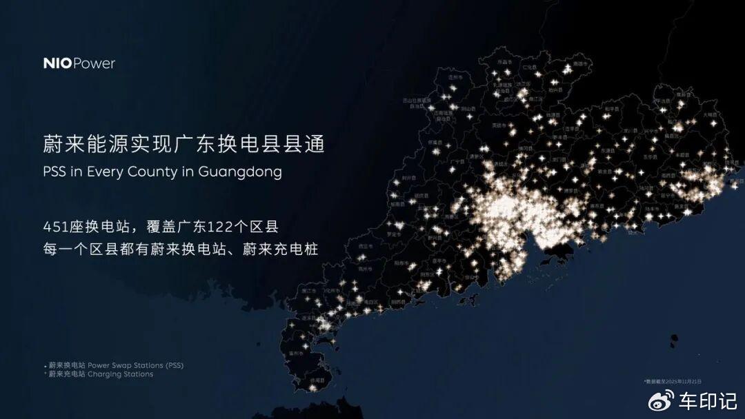 在广东省的地界之内,蔚来已然建造完成了451座换电站,还拥有505座充电站,以及数目为3 622根的充电桩,并且其覆盖范围涉及全省的122个区县,于广东省达成了换电在各个县均能实现通达的情况 。