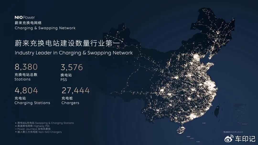 蔚来持续坚持在补能基建方面进行投入,全力致力于去构建全球最为强大有力的补能网络。截止到2025年11月21日这个时间点,蔚来在全国范围内已经对充换电站进行了布局,数量达到8380座,其中换电站有3576座,充电站有4804座,充电桩有27444根,其建设数量在行业当中处于第一的位置。