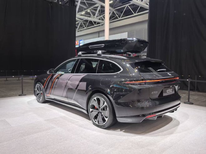 车辆留存了ET5T旅行车那经典的体态,前脸处标志性的Double - Dash日间行车灯以及封闭式格栅被延续了下来。在侧面,新车装配了20英寸五辐风速轮圈,还配备了亮眼的气辉橙制动卡钳,这进一步强化了运动氛围。身为旅行车,车顶行李架导轨是标准配置,兼顾了造型以及户外拓展的实用性。车尾借助专属的“暗影套装”标识表明了其限量的身份。