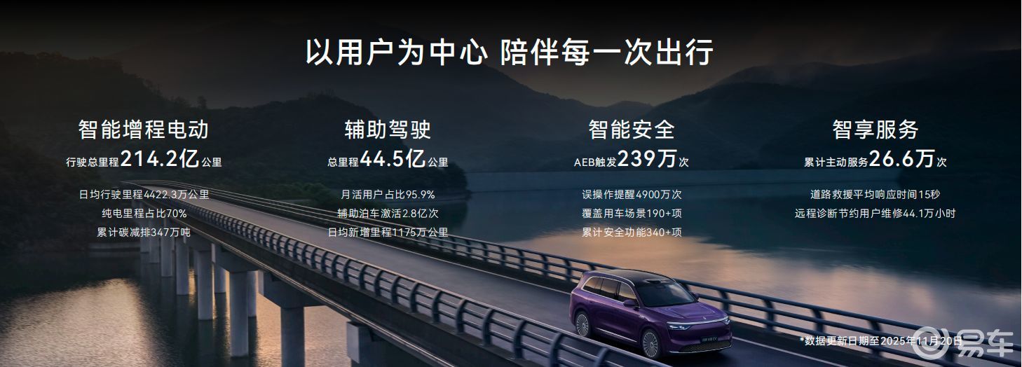 问到2025年11月20之日,问界不但收到了90万住户 的信赖更是给出了出色的运营信息,智能增程式电动跋涉的总路程超过了214亿千米 纯电能行驶的之比达到70% 辅助驾驶的总里程冲破了44.5亿千米 辅助泊车被激活了2.8亿回 总共减少了3于47万吨的碳排放量。