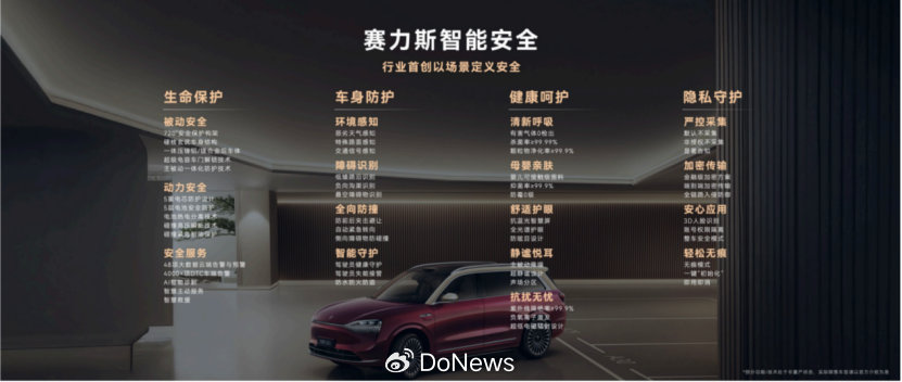 赛力斯把“打造整车极致安全”刻入企业生存底线,在业内率先开创“以场景定义安全”的核心理念,构建起智能安全体系,该体系覆盖“生命保护、车身防护、健康呵护、隐私守护”四大领域,能全方位守护人、车、物安全,为用户提供全生命周期的安全保障,切实践行“安全是最大的豪华” 。