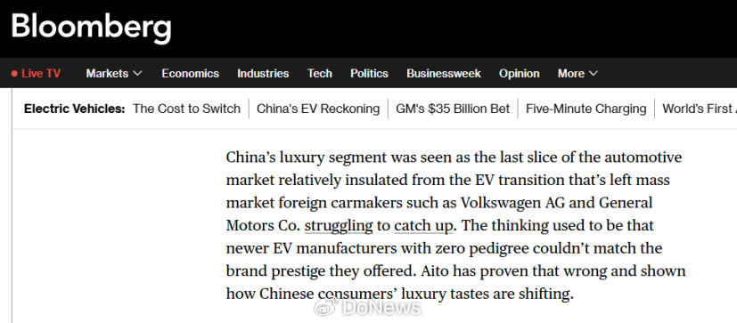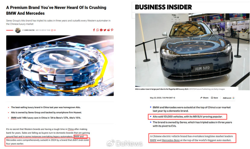 问界,这个重塑了豪车价值新标杆的品牌,引发了大量外媒的争相报道。《彭博社》宣称,赛力斯已然超越宝马、奔驰等传统豪华品牌,成功跻身高端汽车市场前列。《Business Insider》表示,中国一家电动汽车品牌(问界)赶超了宝马、奔驰等老牌市场领军者,在全球最大汽车市场中问鼎。《Carscoops》同样声称,宝马和奔驰在2024年的销量,甚至被一个四年前还不存在的品牌(问界)给彻底超越了。