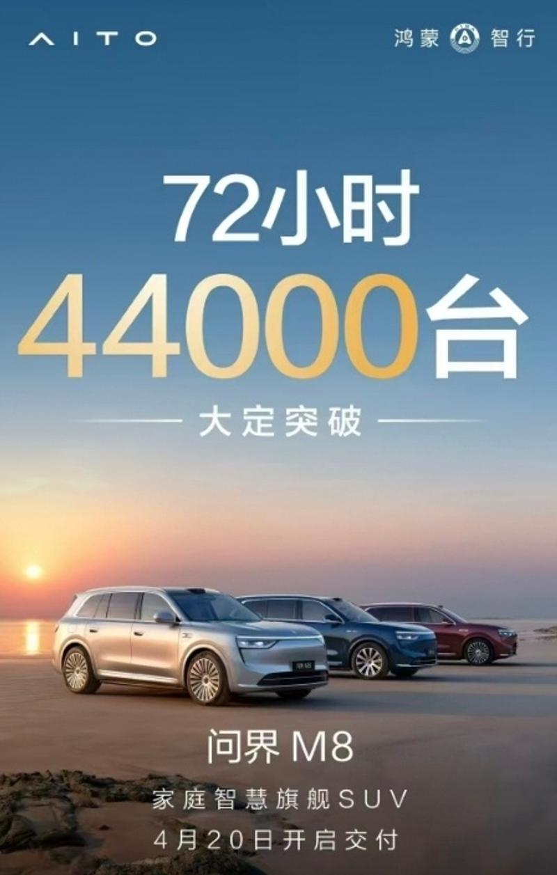 易车讯,4月19日这一天,鸿蒙智行公布了享界S9增程版的订单数据,也公布了问界M8的订单数据。其中,享界S9增程版上市72小时后,大定数量突破了5200台;问界M8上市72小时后,大定数量超过了44000台。
