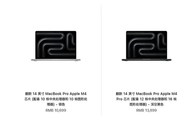 14英寸和16英寸的MacBook Pro系列,是在前几天刚刚下架的,这次它们也加入到了官翻的阵营当中。其中,那个搭载M4 Pro芯片的高配版本,降价的幅度十分惊人,一下子就跳水了足足三千块钱。