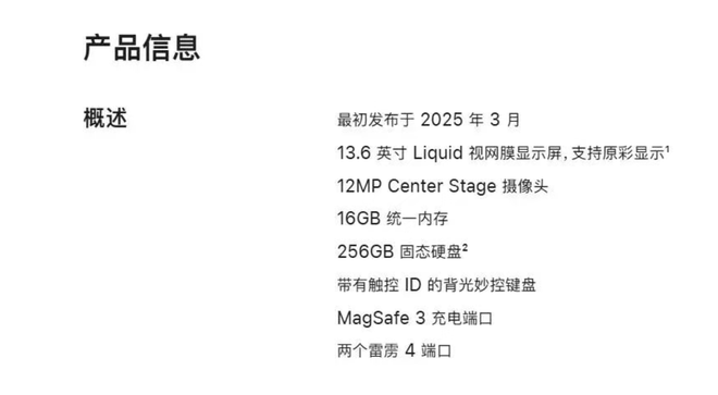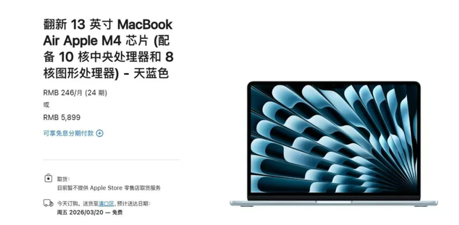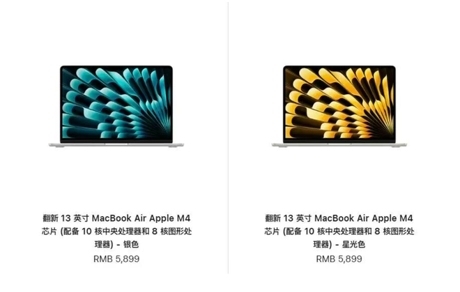 首先看那令人最为震撼的13英寸MacBook Air,它搭载着最新的M4处理器,其标配为16G内存以及256G存储。而这台机器的官方翻新价格,直接被定在了5899元。