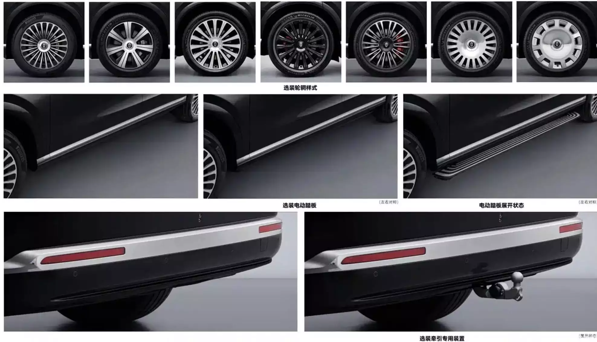 就外观方面而言,细节有所升级,新车整体上延续了现款那种大气的轮廓,然而核心的升级之处却是在细节部分。它换装了尊界S800相同款式的门把手以及“大饼”轮毂,摒弃了现款的隐藏式门把手,采用的是半隐藏式的,这样做既能够兼顾实用以及豪华的质感,又可以避免低温故障所带来的风险,而且在操作的时候会更加便捷且可靠。“大饼”轮毂呈密辐式形态,配合的是不同规格的静音轮胎,从而提升了尊贵的感觉以及行驶时的静谧性,另外还有运动黑化多辐轮毂可供选择,以此满足不同的审美需求。