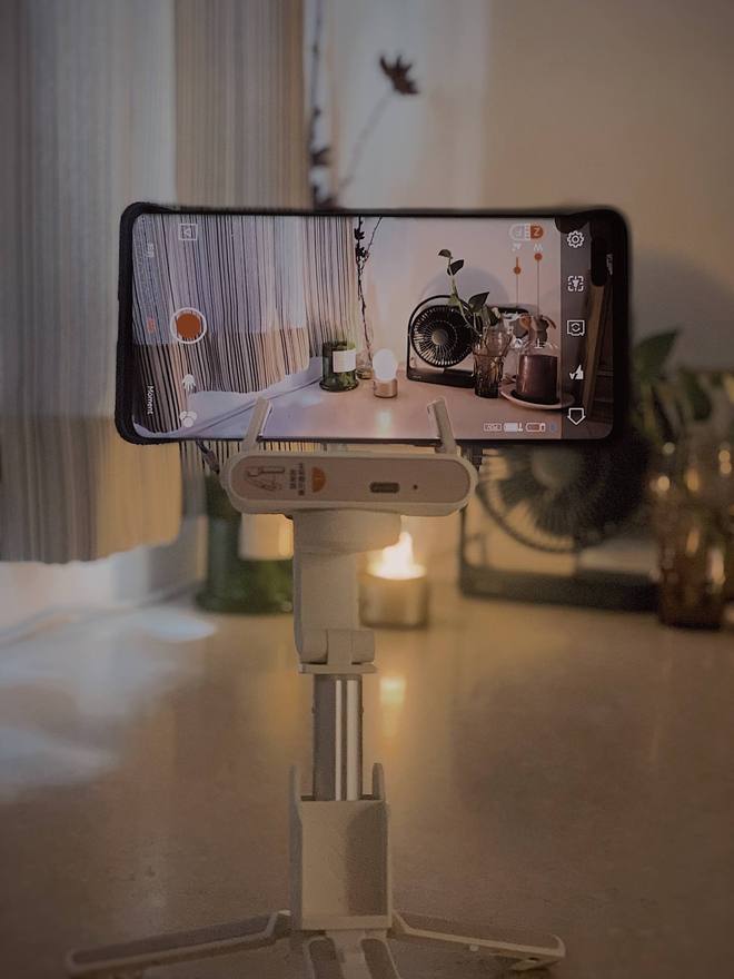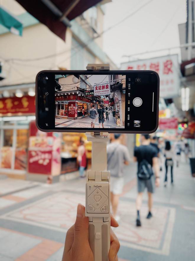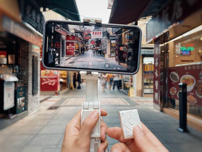 作为手持稳定设备使用:组装三脚支架,配对蓝牙,启动Hohem Joy软件,即可开始录像。小Q配备的独轴无刷马达减震性能卓越,确保我们在移动时也能获得平稳清晰的影像,非常适合旅行记录和店铺探访场景。