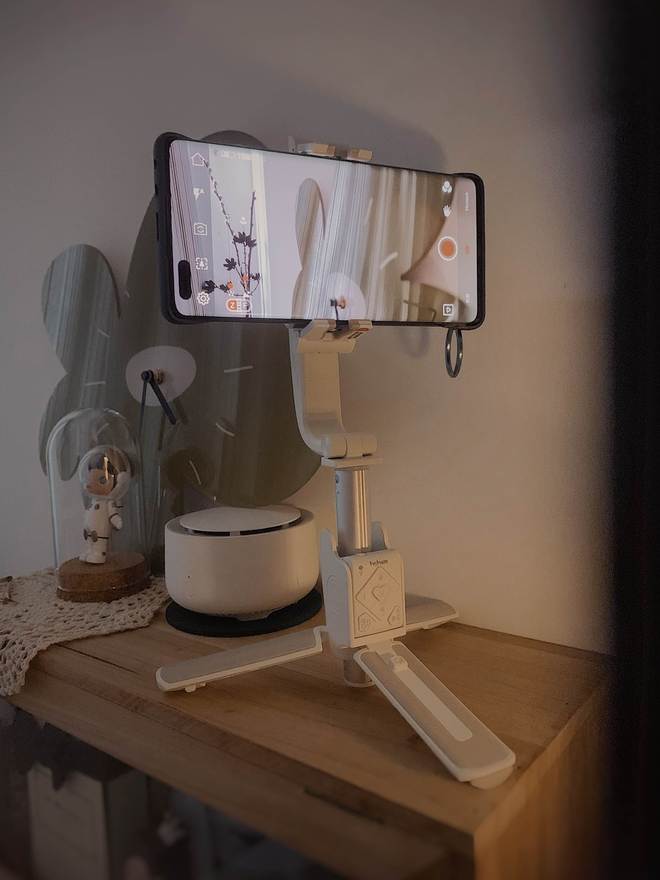 作为全方位砖面旋转支架应用:支撑杆上设有斜面转动构造,只需把手机夹沿着支撑杆旋转九十度到水平位置,然后把小Q放在水平桌面上,按下三次功能键,小Q就能自动旋转整圈完成全景环绕拍摄,非常适合在海滩、山岭等开阔场景使用。这项功能在我们外出旅行以及日常居家视频录制时同样很有用。将小Q安放到平坦桌面上,调整好高度和角度,打开Hohem Joy App,选择人脸识别模式,就能用控制器随时操作,使小Q成为我的专属摄影帮手。