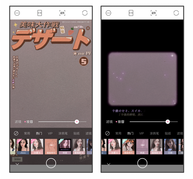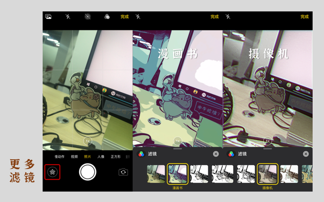 此处可以选用滤镜功能,除了常规相机自带的效果外,还囊括了漫画风格、水墨画意、模拟摄像机、水彩渲染以及复古老片等多种艺术化处理选项。