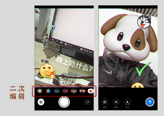 在这个界面,能够对图像进行再次加工,涉及文字、图形以及贴图表情的功能,贴图表情的资料源自于你手机上的应用软件。