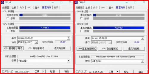 CPU-Z 单核测试中,英特尔 836 得分高于 AMD 671.8,前者比后者多出 24 分,优势明显。