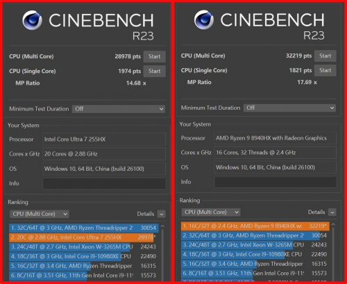 老版本测试程序(CINEBENCH R23)显示,英特尔平台得分28978,AMD平台得分32219,前者比后者低了十分之一,因为在老旧系统环境下,AMD处理器的多核心性能表现更为突出