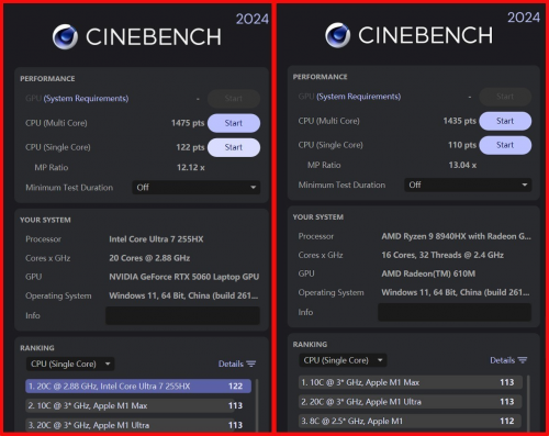 最新版本的应用程序(CINEBENCH 2024):英特尔处理器获得1475点,AMD处理器得到1435点,前者超出后者3个百分点,因为英特尔的新设计对这款应用软件的适配更为完善