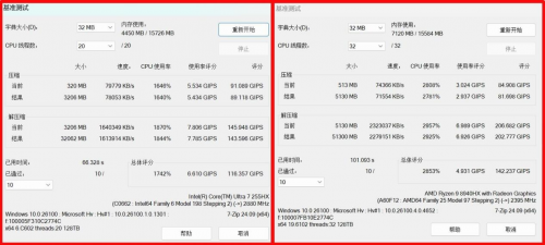 7-Zip压缩:酷睿速度达到78053KB每秒,锐龙速度为71554KB每秒,前者比后者快百分之九,压缩大型文件时能节省更多时间。