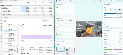 分配任务:英特尔借助 NPU 完成背景模糊处理时,NPU 使用量达到 41%,RTX 5060 显卡耗电量仅为 6.8-16.7W,温度在 55℃左右;AMD 缺少 NPU,必须依靠显卡负责,显卡耗电量猛增至 8.8-21.3W,温度大约 65℃——英特尔不仅让显卡轻松些,还减少了整个系统的能耗;