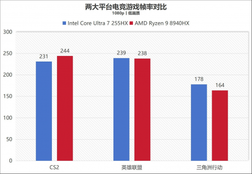 虽然锐龙九 8940HX 的峰值时钟(5.3GHz)稍快于英特尔(5.2GHz),然而英特尔的 TSMC N3B 工艺和龙鹰架构,显著增强了单线程效率,对于《英雄联盟》《CS2》这类需要单核表现的游戏,这种优势直接带来更流畅的高帧数,防止画面中断。