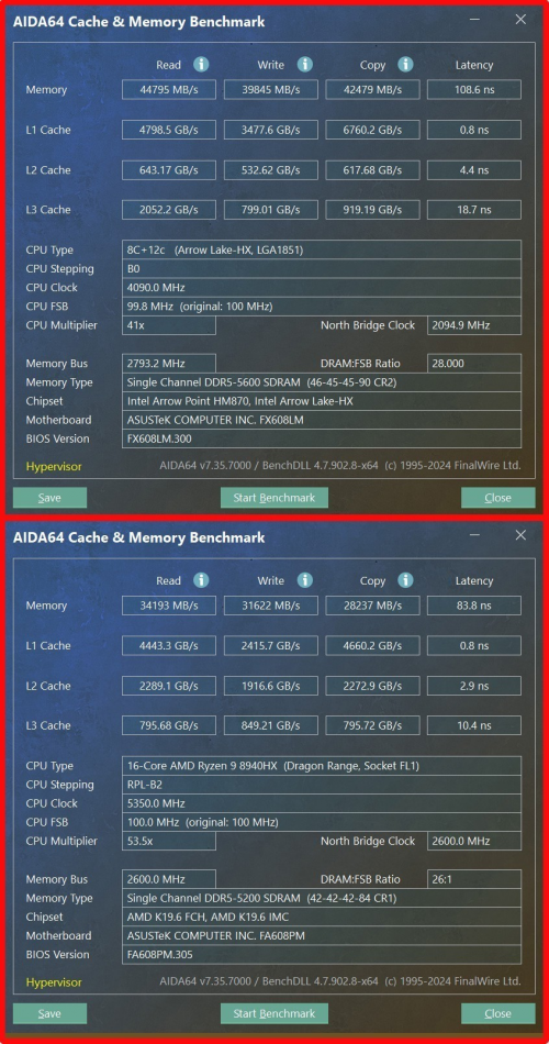 传输速率方面,英特尔型号表现更佳,达到44795MB每秒,而AMD产品为34193MB每秒,前者比后者快了31个百分点