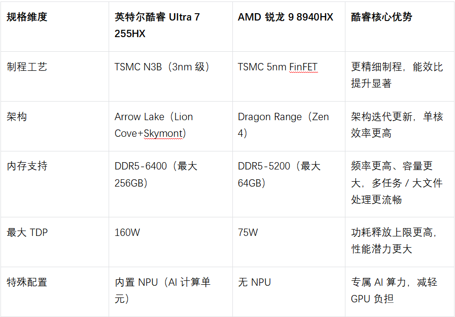 目前游戏本市场,英特尔酷睿 Ultra 7 255HX 和 AMD 锐龙 8940HX 是两大主要竞争机型,前者是英特尔新平台的高端产品,以 “AI 高效静音游戏本” 的理念重新定义游戏本使用感受,后者虽然是上一代平台,却依靠高性价比赢得了一片市场空间。对于许多寻求综合性能的用户来说,酷睿 Ultra 7 255HX 在运行表现、能耗控制以及智能处理方面展现出卓越水平,因此它早已是更值得优先考虑的配置。