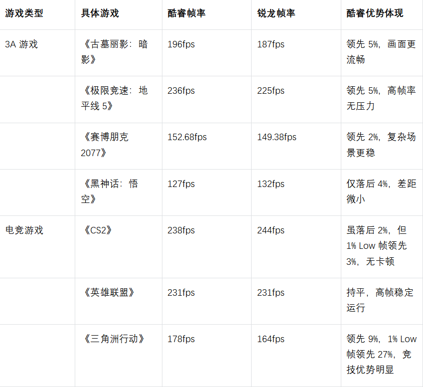 围绕游戏展开,力求帧数稳定流畅:对于顶级游戏或电竞赛事,核心的帧率表现和极低的低帧率情况都更为出色,能够充分满足竞技需求。