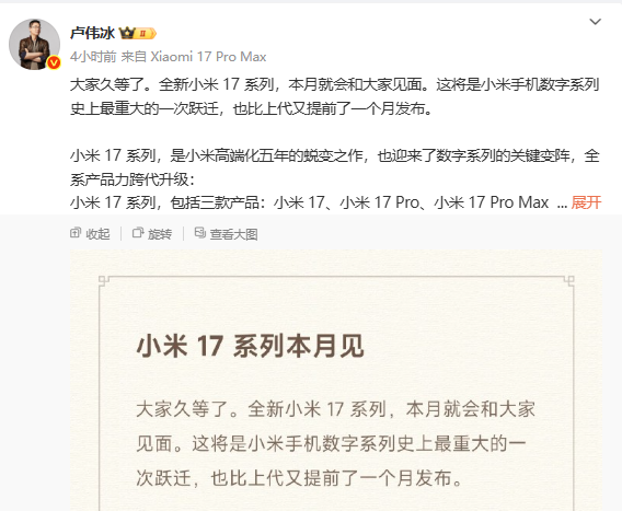 小米这次没有继续16系列,而是直接发布17系列,其命名方式与苹果的iPhone产品线相同。卢伟冰称,这将是小米手机数字系列发展过程中的一次关键性飞跃。