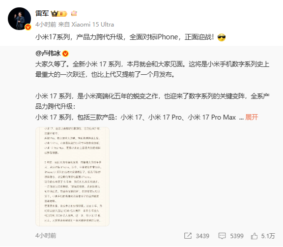 小米的创始人雷军紧接着在社交媒体上表明立场:小米十七系列,其性能实现了代际飞跃,全方位参照苹果公司的产品,展开正面交锋!这反映出小米在高端产品领域的竞争思路走向了更激烈的阶段。