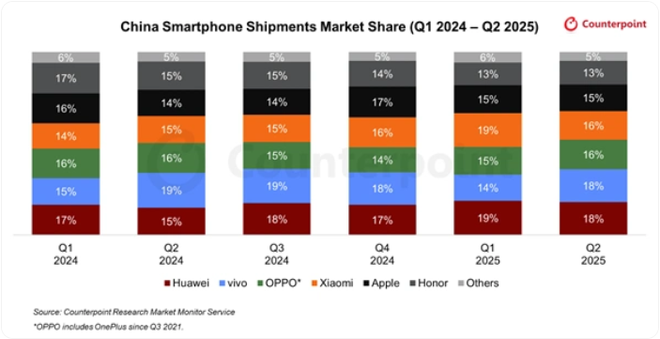 上周公布的中国手机销售情况排名,按照品牌分析,华为占有百分之十八的份额,vivo的占比也是百分之十八,OPPO排第三,其销售比例是百分之十六,小米位第四,销售占比同样为百分之十六。
