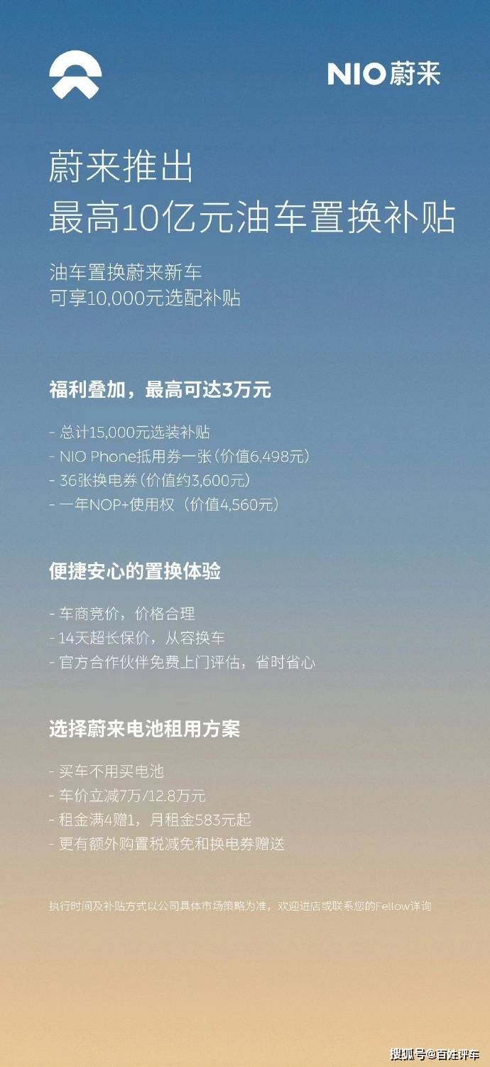 蔚来公司宣布发放十亿元燃油车更换奖励,燃油车车主更换蔚来2024款车辆,除当前福利外,还能得到额外一万元的配置费用支持,这实际上就是现金优惠了一万元。更换车辆者若选择蔚来电池租赁计划购车,还能享受车辆价格直接降低七万元或十二万八千元,购车税金特别减免,以及电池租赁服务费四付一赠的优惠活动,电池的月租费用最少只需五百八十三元。