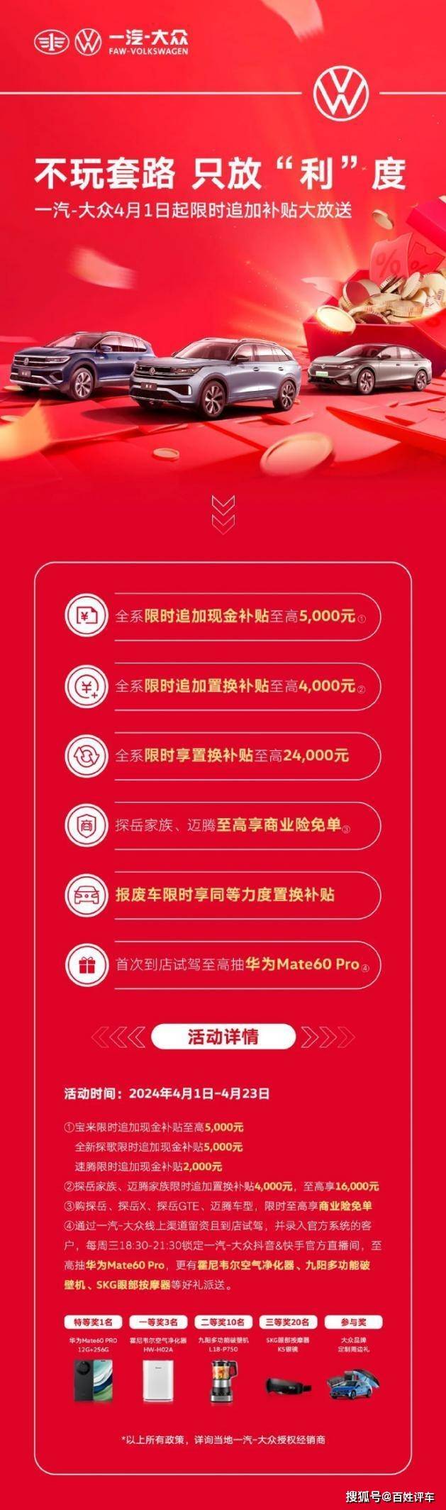 合资品牌方面,一汽-大众宣布特别促销方案,针对4月1日至23日期间购车者,提供多项优惠措施,包括最高5000元现金返现、最高4000元旧车置换奖励、最高24000元置换优惠、探岳家族及迈腾车型可获商业保险免费服务,以及报废车辆可享受同等优惠的置换政策。