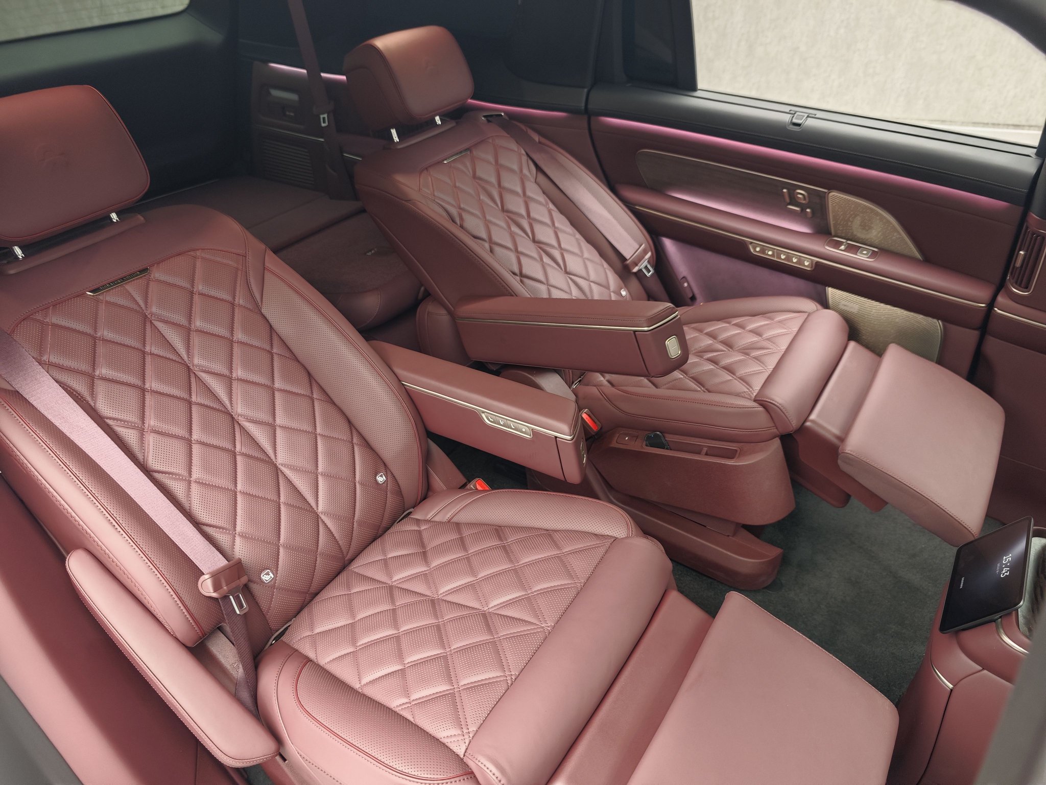 驾驶舱座椅部分,助手位和第二排均配备三把零重力坐具,这些坐具具备22种电动调节功能,并且带有加热、通风和按摩功能,第二排右侧的零重力坐具能够横向移动150毫米,从而拉近与乘客的间距,第三排腿部区域宽度达到850毫米,其靠背角度可以调整到130度,同时支持一键电动放平。拥有同级别最大的547升后备箱容积,配备230升容量充足且采用感应电动开启的前备箱,可以轻松容纳6个人和12个行李箱。