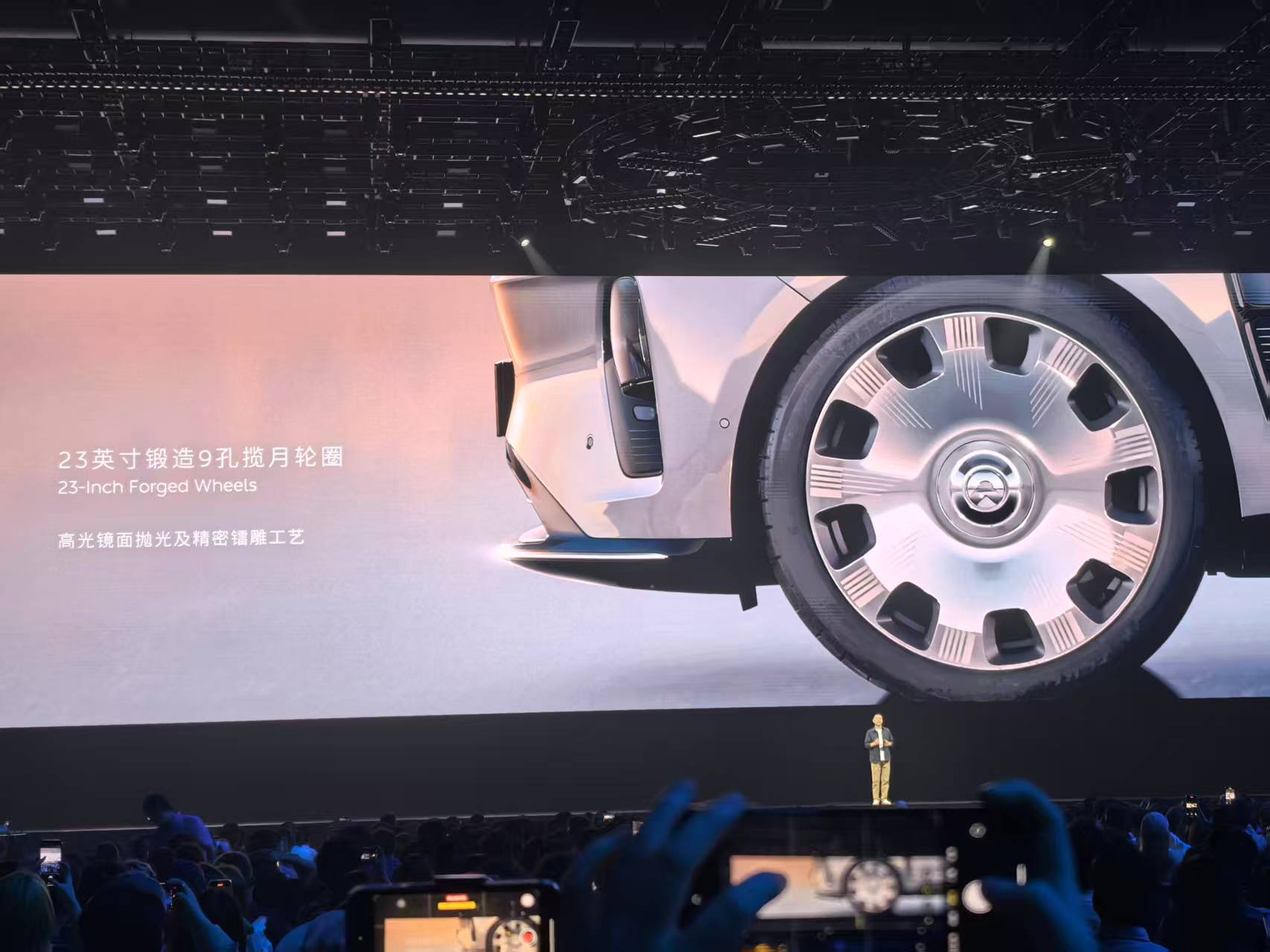 新座驾装载了匠心打造的专属23寸九辐轮毂,轮圈外层经过极致抛光,呈现镜面质感,搭配悬浮式轮眉设计,制动单元也换成了特别配色,共同营造出高级感十足的旗舰氛围。此外,C柱和车尾位置还增加了专属徽标,用以彰显独特地位。在车身规格上,该车的长宽高分别为5324毫米、2016毫米和1620毫米,轴距维持3250毫米不变。
