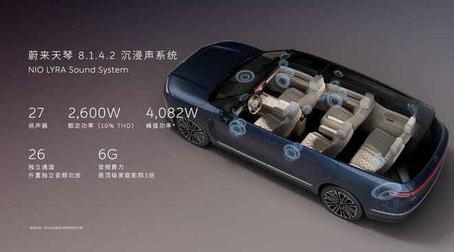 全新ES8配备蔚来天琴8.1.4.2沉浸声系统,该系统包含27个扬声器单元,其额定功率为2,600W,峰值功率可达到4,082W,能够提供杜比全景声的音效体验,并首次应用了Dirac RRM「超境临场」技术,其声场再现效果非常出色。