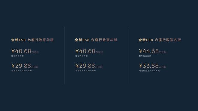 9月20日有消息透露,于2025蔚来日活动中,蔚来发布了全新ES8车型;价格方面,六座行政豪华版定价406,800元起步,若选择BaaS电池租用方案,价格则调整为298,800元起步,六座行政签名版定价446,800元起步,同样支持BaaS电池租用,起售价为338,800元起步,七座行政豪华版定价与六座行政豪华版相同,均为406,800元起步,电池租用方案的价格也一致,为298,800元起步。全新ES8将于9月21日起正式开启交付。