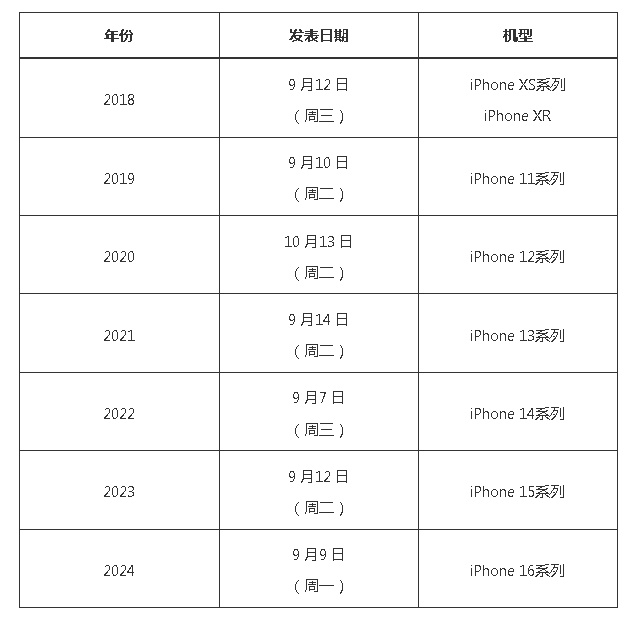 以下为近七年苹果秋季发布会iPhone新品时间点: