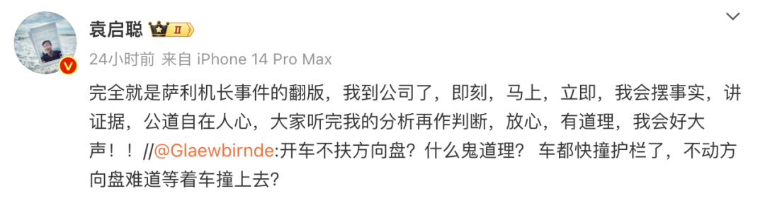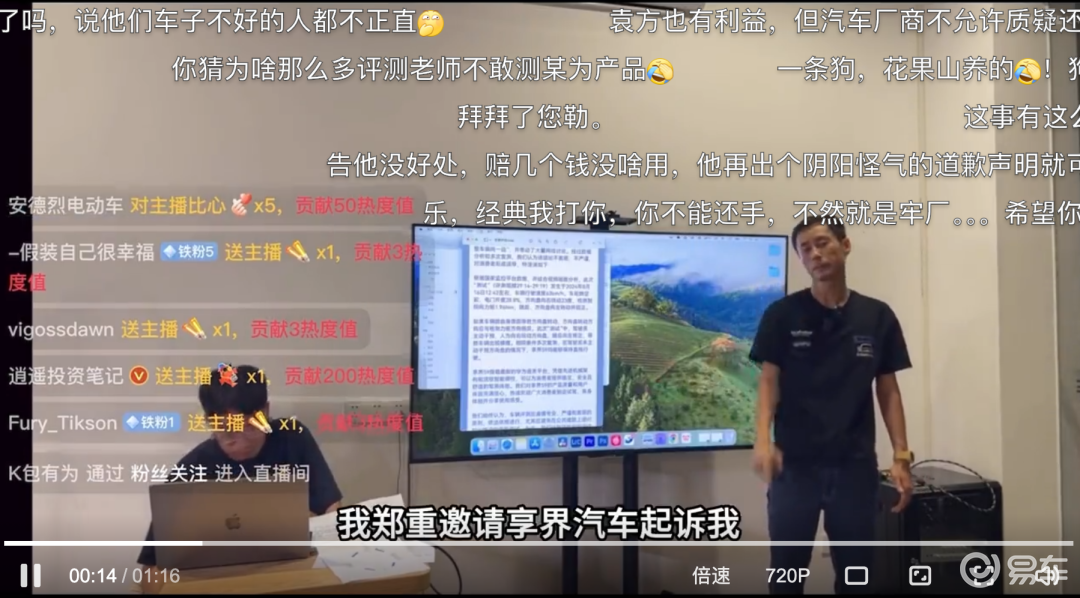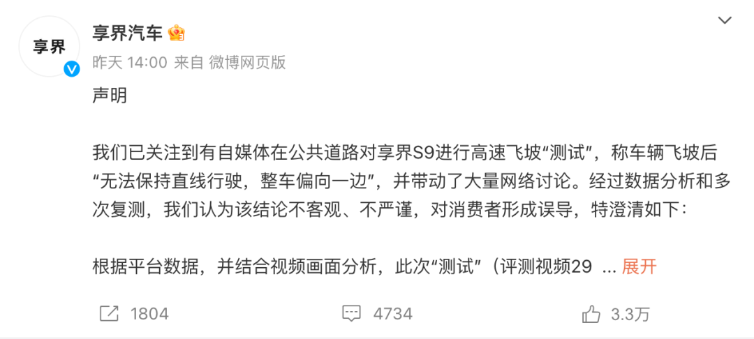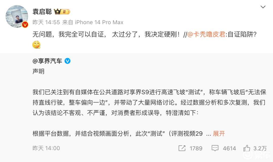 关于享界汽车发布的声明,@袁启聪 在8月25日通过微博平台连续发布了数条信息,他表示自己注意到了这份声明,对于方向盘为何会出现偏转的情况,他强调有充分的科学依据支持,并且计划在下周进行详细的说明,他还表示自己完全有能力证明相关情况,认为对方的行为已经十分过分,因此他决定采取强硬的态度进行应对。那天下午,针对享界汽车给出的说法以及一些车评人的疑问,@袁启聪紧接着通过视频连线的方式作出了说明,他表明自己确认了享界汽车公布的信息,并且在视频连线里对自己在试验期间转动方向盘的举动进行了说明,不过他着重指出自己当时施加的转向力度非常小。