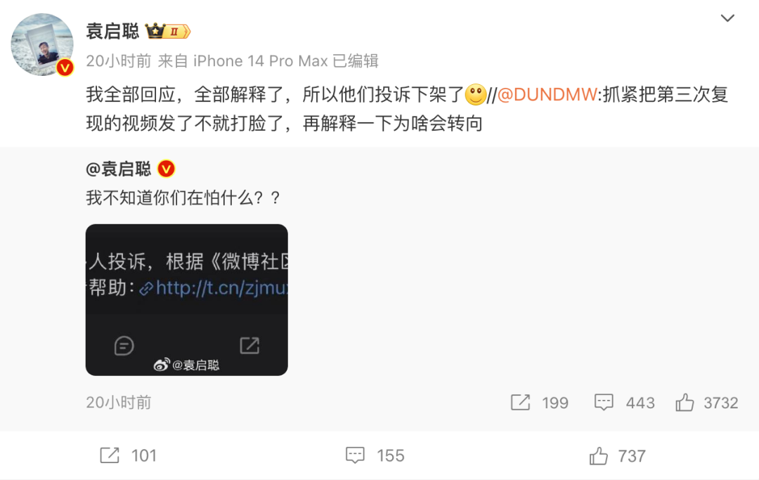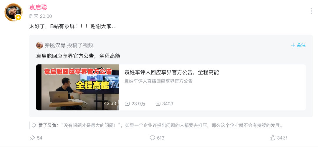 值得注意的一个情况是,直播活动结束之后,@袁启聪 的微博平台账号遭到禁用,官方给出的理由是“触犯了某些法律规定”。与此形成呼应的是,@袁启聪 之前制作并上传的关于享界S9的评测影片也收到了举报并被从平台移除。就在今天清晨,@袁启聪 在哔哩哔哩网站发布了新动态,内容是“允许自己休息一个星期”。这件事已经过去了,后续如何都行,不在乎谁对谁错,也不在乎谁输谁赢,只是看法和立场不一样而已,不再争论了,不再争论了。与此同时,微博的负责人@来去之间 也表示,@袁启聪 被限制账号的原因或许是因为“损害了商业环境、评估方法不恰当,并且对方是国有企业!”