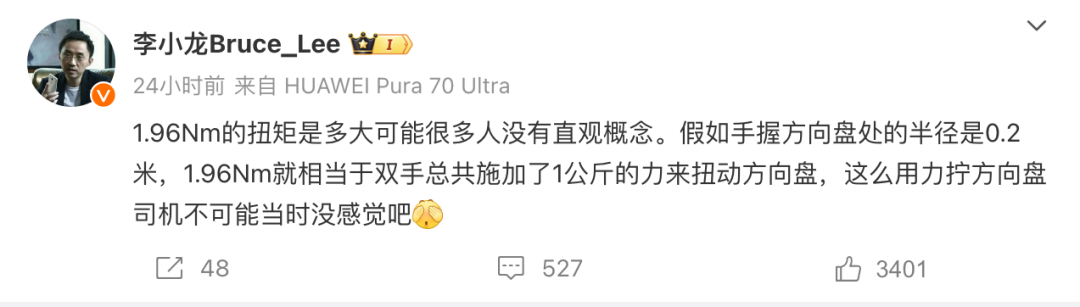 华为手机事业群首席技术官李小龙在微博上提及享界S9飞坡事件,他指出,1.96牛米的扭力强度,许多人难以形成具体认识。李小龙打比方称:如果方向盘握持端半径为0.2米,那么1.96牛米就相当于双手合计用了1公斤的力去转动方向盘,这种力度拧方向盘,司机不可能毫无察觉。